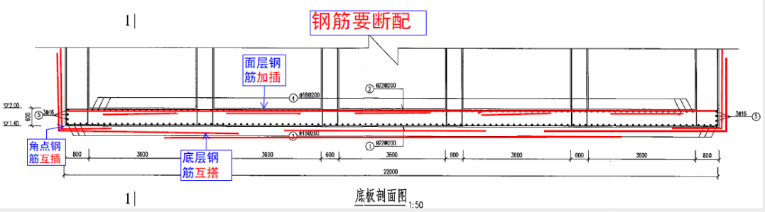 为提高溧水经济开发区圩区排涝能力,新建三丫圩、章西圩、凌庄圩3座排涝站工程。三丫圩排涝站设计排涝流量13m3/s,主泵采用5台900ZQ-85D型潜水轴流泵,总电机功率1250千瓦;章西圩排涝站设计排涝流量10m3/s,主泵采用4台900ZQ-85D型潜水轴流泵,总电机功率1000千瓦;凌庄圩排涝站设计排涝流量7m3/s,主泵采用3台900ZQ-85D型潜水轴流泵,总电机功率750千瓦。 会上我公司咨询专家对:泵站引河与周边河道平面衔接;出水池隔水墩布置;沉管灌注桩桩长、桩距;翼墙配筋;电气设备布置等提出了许多合理化建议。 指导设计人员钢筋混凝土结构配筋要坚持“两原则、六字方针”,两条原则:①满足构件最小配筋率要求;②满足构件极限承载力要求和构件正常使用极限状态下裂缝开展宽度及挠度变形要求。配筋六字方针:“断配、互插和互搭”。以泵室配筋为例,泵室为框架结构,各框架固支连接点外侧钢筋适当加长,互插借用,变构造钢筋为受力钢筋,增加角点抵抗弯矩值;隔墩处底层钢筋互搭;面层钢筋中间加插加强短筋。如下图所示: