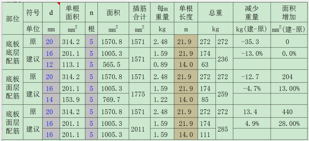 据此原则,建议底板面层、底层配C20@20的通长钢筋改为C16@20,角点处钢筋互插、面层钢筋加插和底层钢筋互搭C12/14/16@20。 施工图泵室底板面层原配钢筋和建议配置钢筋对比表  由表中可看出泵室底板面层原配C20@20的通长钢筋改为C16@20+加强短筋C12@20,钢筋用量减少13.0%、面积两者持平,即安全系数相同;C16@20+加强短筋C14@20,钢筋用量减少4.7%、面积增加13.0%,即安全系数提高13.0%;若改为C16@20+加强短筋C16@20,钢筋用量虽增加4.9%、但面积增加28.0%,即安全系数提高28.0%。 (供稿:设计分公司 卢士亮) |